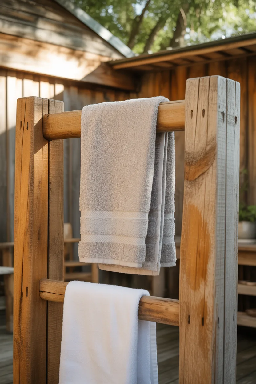 A Pool Towels Rack in ladder style is both stylish and functional. It leans against a wall and provides multiple levels for hanging towels.