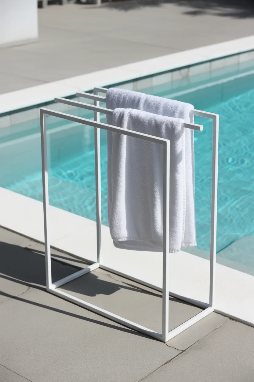 A Towel Rack For Poolside made from metal gives a sleek and modern look. It is durable and resistant to weather conditions.