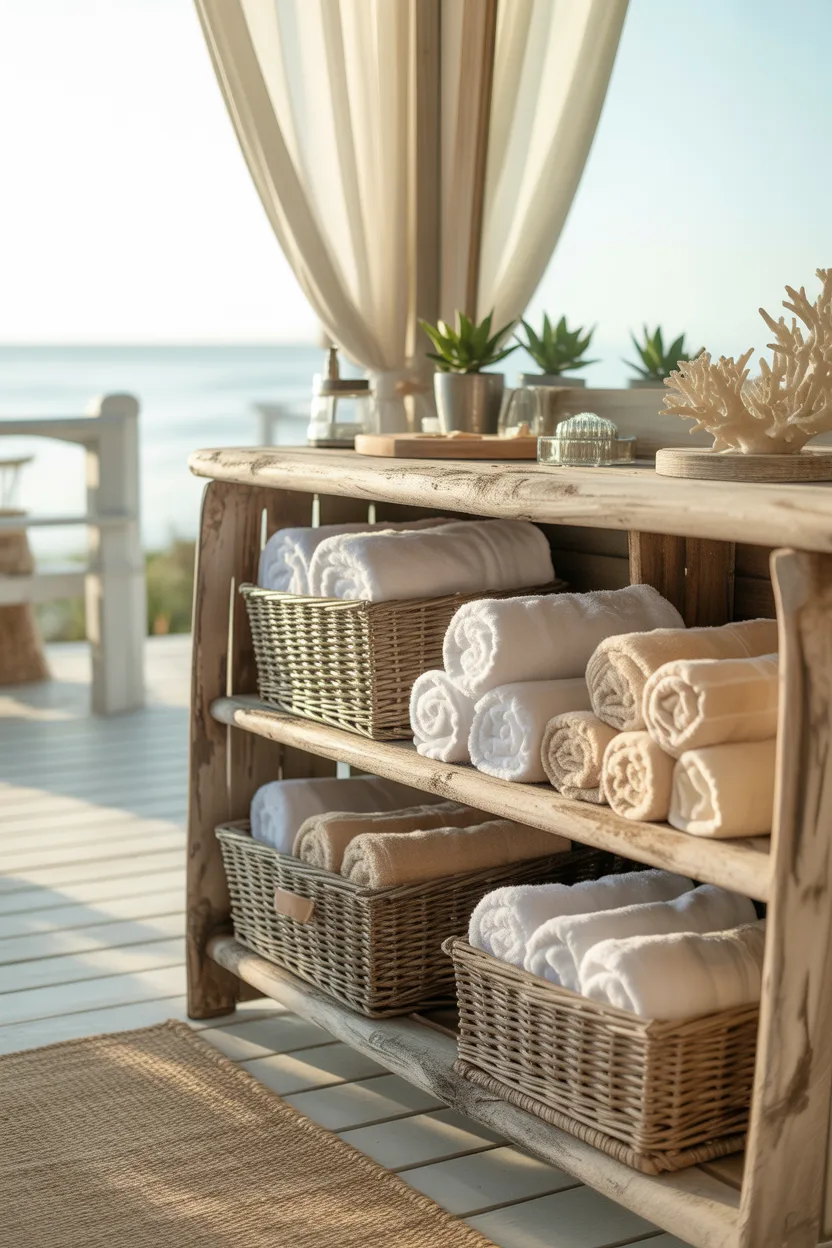 Beach Towel Storage Ideas using open shelves create a resort-style look. They make towels easy to access.