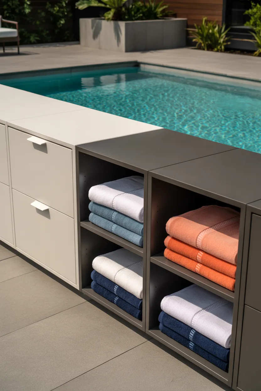 Pool Deck Towel Storage cabinets provide a clean and organized look. They are ideal for large pool areas.