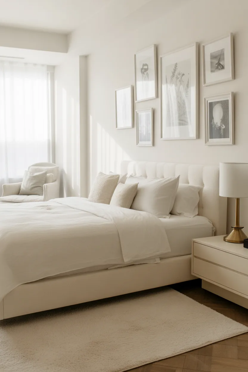 Even in a white bedroom, a subtle accent wall in cream or taupe adds dimension. This creates contrast without overpowering the clean aesthetic.