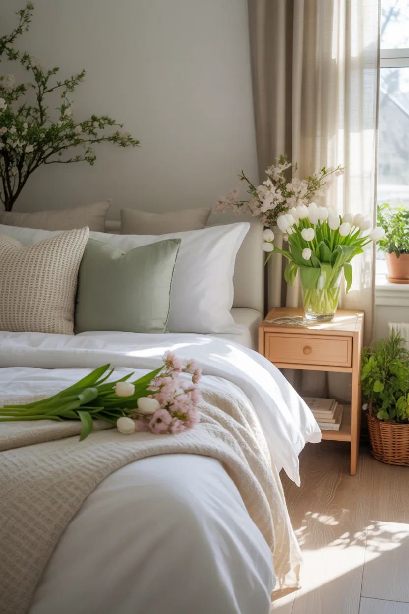 Incorporate soft seasonal elements like woven baskets or fresh florals inspired by spring home decor.