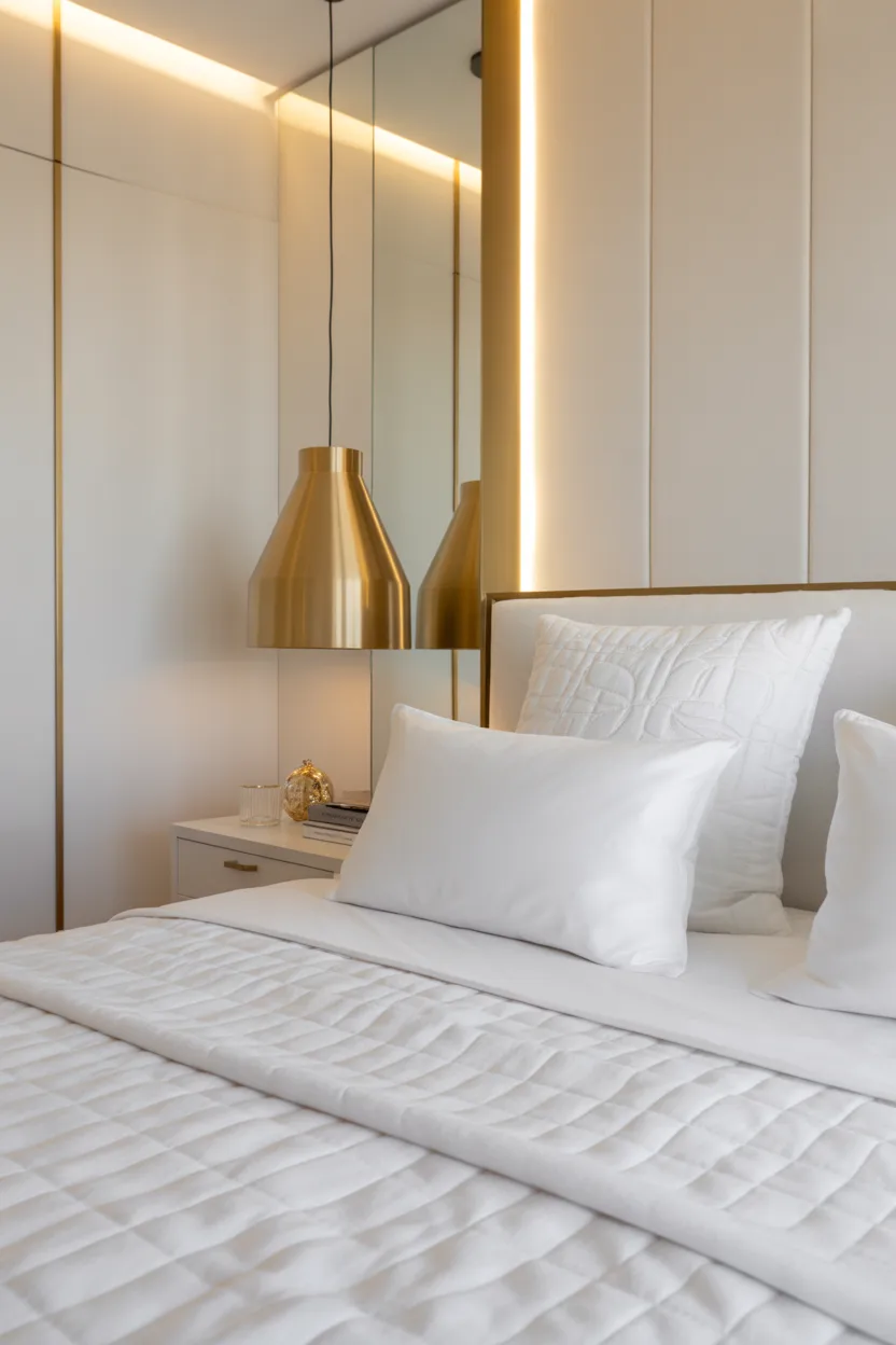 Add gold bedside lamps, picture frames, or drawer handles. This subtle metallic touch enhances an elegant bedroom design without overwhelming the palette.